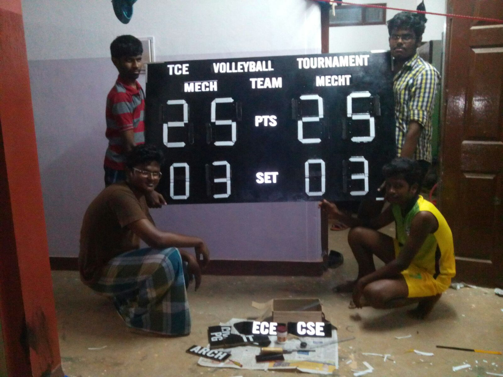 Manual scoreboard is a seven-segment display style build made from plywood and door hinges. Gallery Video